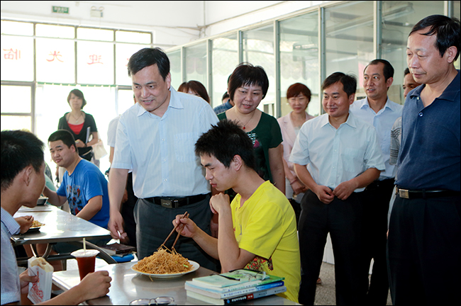 在调研期间,刘校长还深入纺织材料实训中心、服装快速反应实验室、服装工艺实训室等察看了实验室建设情况。调研结束后,刘校长走到刚刚下课的同学们中间,认真察看了桐柏路校区校园环境,并视察了运动场改造工程施工进展情况。中午时分,刘校长前往学生第一、第二食堂,详细询问食堂经营情况,并和正在就餐的学生交谈,了解饭菜的质量、价格等信息。随后,刘校长在第二学生食堂和师生一起就餐。