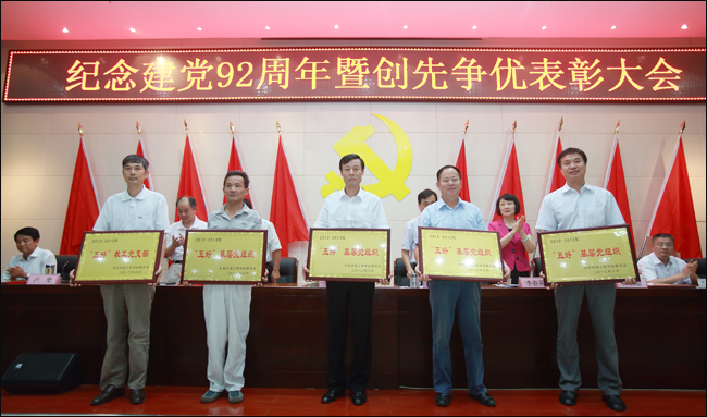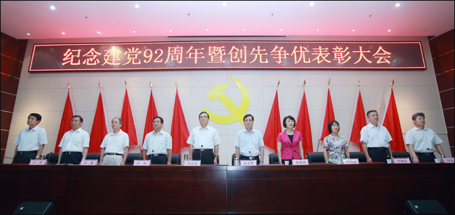 6月26日下午,我校在综合楼二楼会议室隆重召开“纪念建党92周年暨创先争优表彰大会”。校党委书记周太良,校长、党委副书记刘文锴,校党委副书记齐毅、李春英,副校长周蓬、许瑞超、卢奎、李晓春,校工会主席李东风,副校级调研员周福义参加大会。受表彰的先进集体、先进个人和全体党员处级干部、党支部书记参加大会。校党委书记周太良同志在大会上做了重要讲话,校长、党委副书记刘文锴同志主持会议。