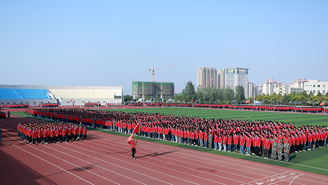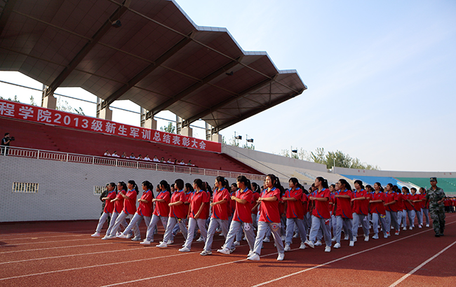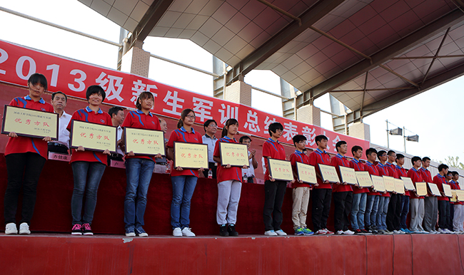 9月18日下午,我校2013级新生军训总结表彰大会在龙湖校区南校区田径场隆重举行。校领导周太良、刘文锴、齐毅、李春英、耿广智、董浩平、周蓬、许瑞超、卢奎、周福义、齐健康以及承训部队教导员刘刚等出席表彰会。表彰会由副校长董浩平主持。