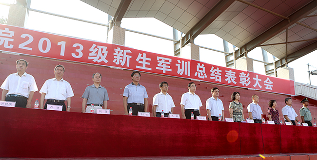 在雄壮激昂的国歌声中,2013级新生军训总结表彰大会正式开始。经过为期八天紧张有序的军训,我校2013级7100余名新生以饱满的精神、昂扬的斗志、严整的军姿、整齐的队列,接受检阅。