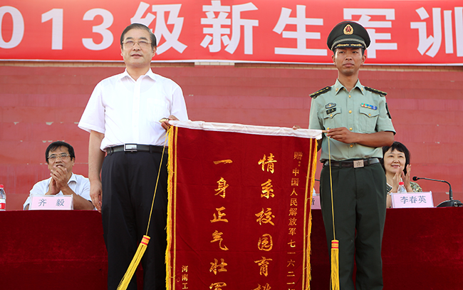 为感谢承训部队对我校军训工作的大力支持,校党委书记周太良代表学校向承训部队赠送了锦旗。