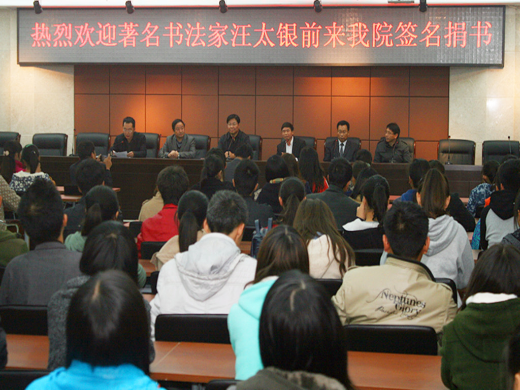10月30日,著名书法家汪太银,央广网公共传播河南频道总编陈首策、主编孙本铭等一行来到我校,为我校师生签名捐书并进行书法指导。校党委副书记耿广智出席了签名捐书仪式。校党委宣传部部长李宝涛,教师书法协会成员,教师代表,学生书画协会成员,校学生会干部参加了捐书仪式。仪式由校团委书记常超主持。