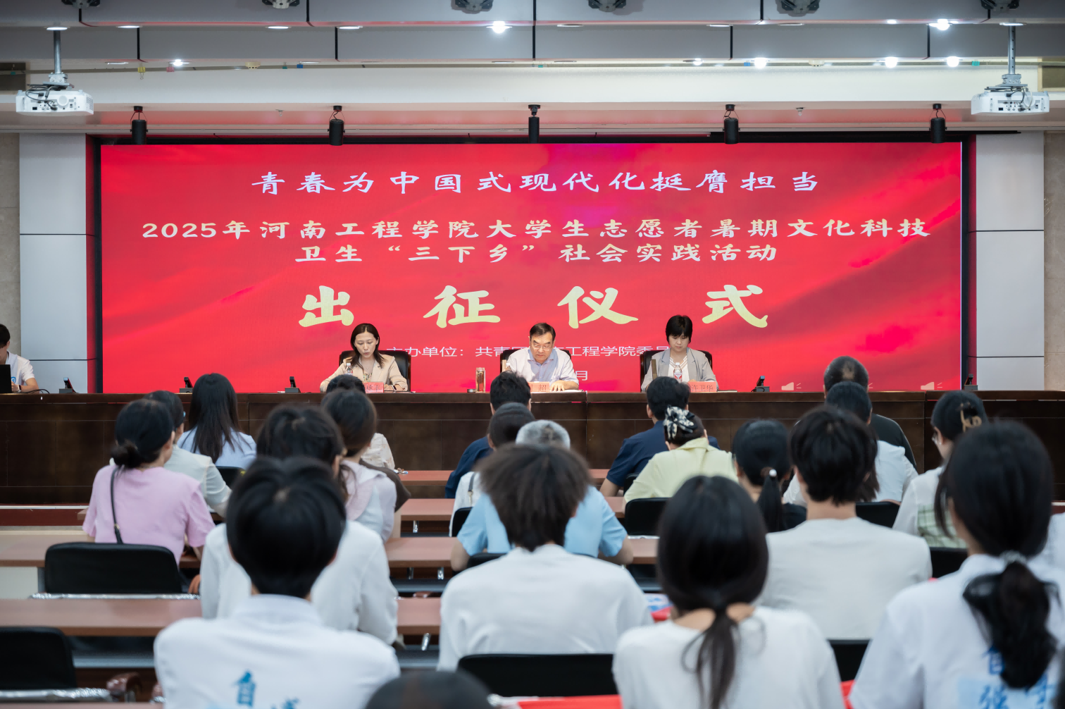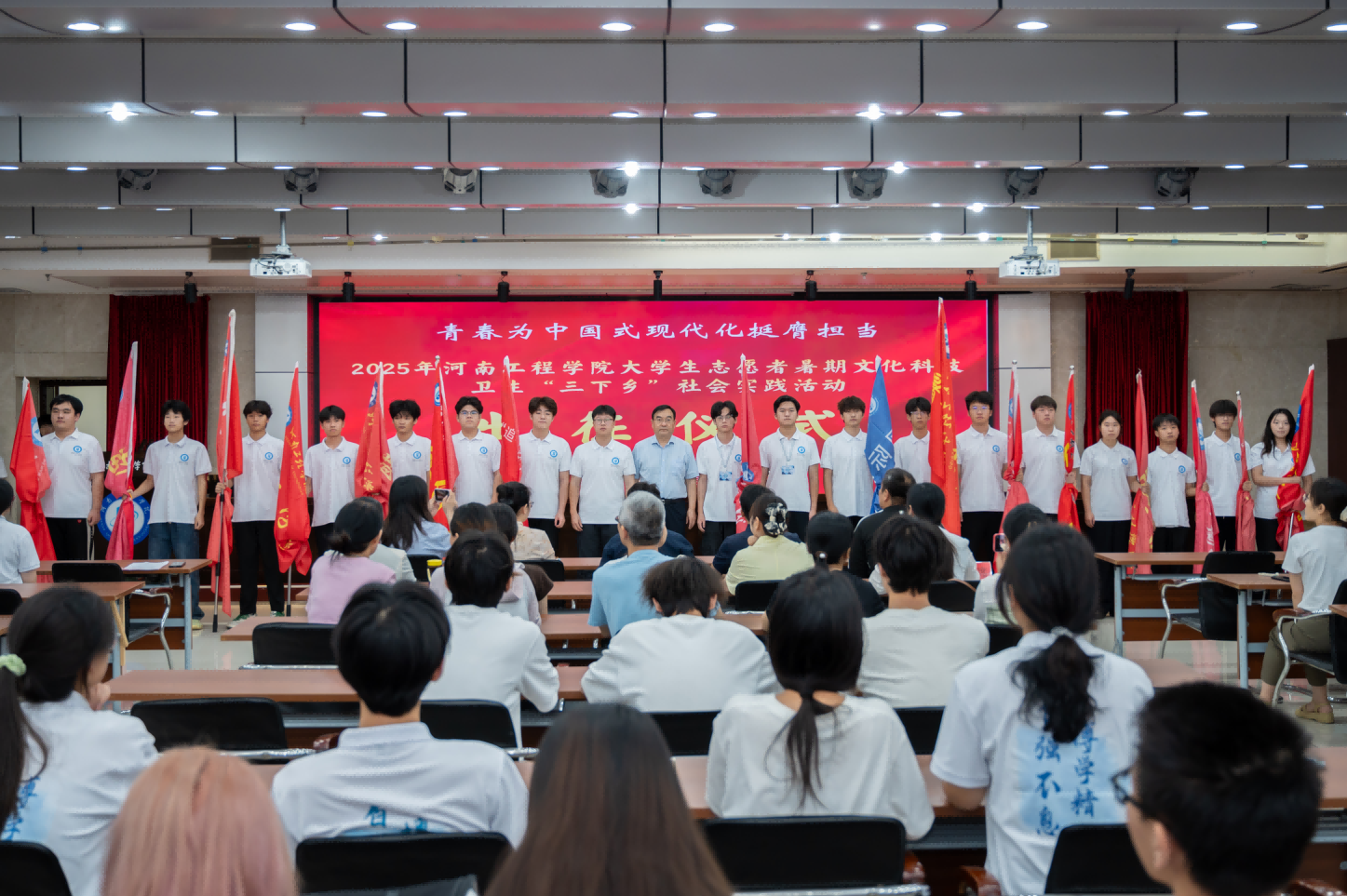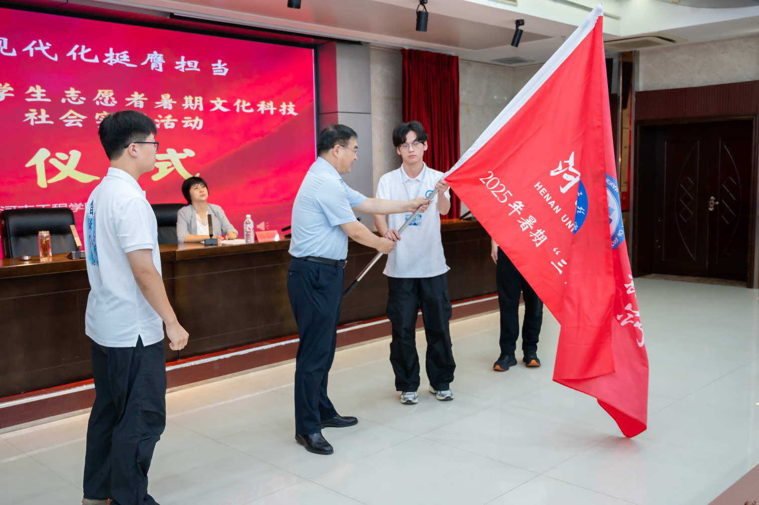 出征仪式在庄严的国歌中拉开帷幕。会上,校团委书记许卫华宣读了《关于开展2025年河南工程学院大学生志愿者暑期文化科技卫生“三下乡”社会实践活动的通知》,并从整体工作安排、文件解读和工作要求三个方面做了详细介绍。