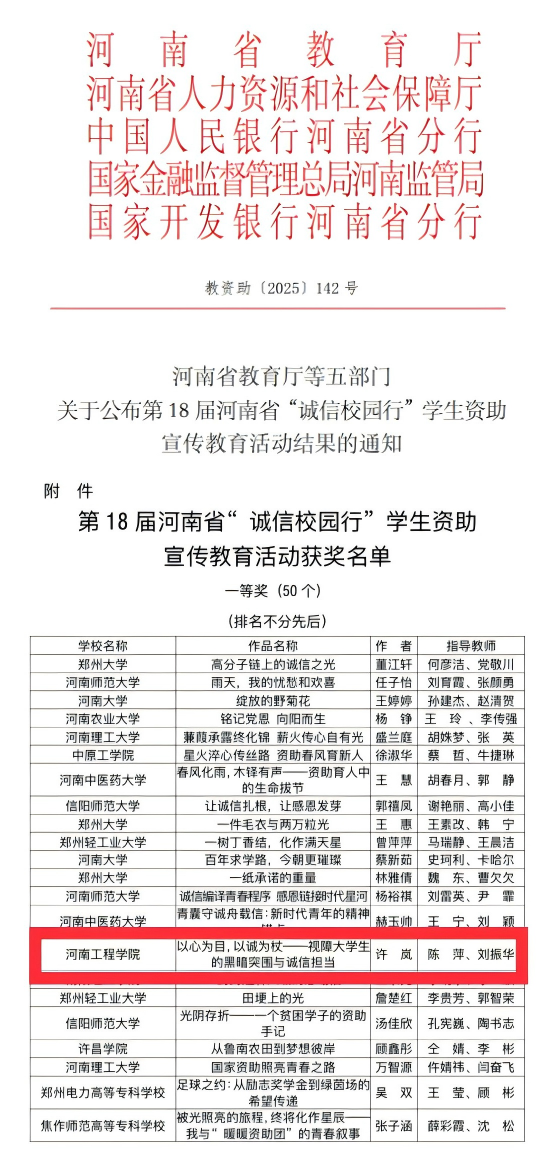 近日,第18届河南省“诚信校园行”学生资助宣传教育活动结果揭晓,我校理学院数学与应用数学2341班许岚同学的作品《以心为目,以诚为杖——视障大学生的黑暗突围与诚信担当》脱颖而出,荣获一等奖殊荣。这是我校自参加该项赛事以来首次斩获最高奖项,实现了学生资助育人工作在省级竞赛中零的突破。