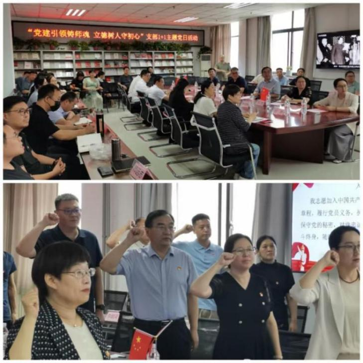 座谈会前,马克思主义学院党总支与机关人事教师发展中心党支部开展了“党建引领铸师魂 立德树人守初心”支部1+1主题党日活动。活动在回顾党的百年奋斗史视频中拉开序幕,全体党员一起重温了入党誓词,三名党员代表深情重温入党志愿书。刘超对此次党日活动表示肯定,他指出通过这样的党日活动,使党员们在回望初心中坚定理想信念,在重温誓言中强化使命担当,永葆革命精神是非常具有仪式感和教育意义的。