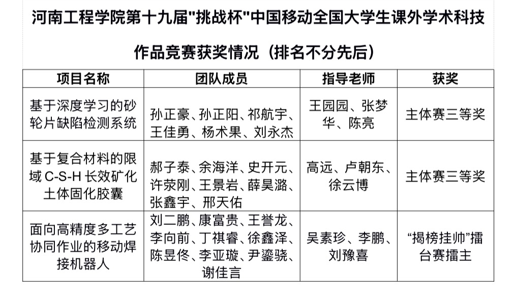 近日,第十九届“挑战杯”中国移动全国大学生课外学术科技作品竞赛终审决赛在南京大学圆满落幕。我校《基于深度学习的砂轮片缺陷检测系统》荣获科技发明制作B类国家级三等奖,《基于复合材料的限域C-S-H长效矿化土体固化胶囊》荣获科技发明制作A类国家级三等奖,2个项目实现了我校在“挑战杯”全国大学生课外学术科技作品竞赛赛道国赛获奖零的突破。在中国青年科技创新“揭榜挂帅”擂台赛(学生赛道)中,我校《面向高精度多工艺协同作业的移动焊接机器人》项目荣获“擂主”1项,也实现了我校在“揭榜挂帅”擂台赛中获奖零的突破。