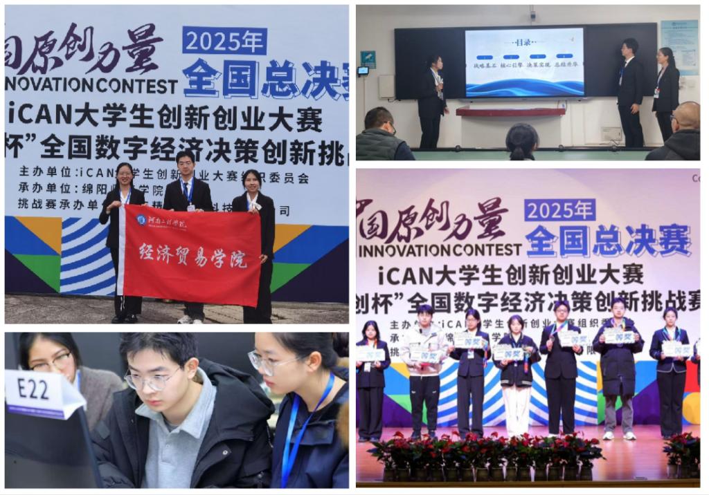 11月23日,2025iCAN大学生创新创业大赛“精创杯”全国数字经济决策创新挑战赛总决赛在四川绵阳圆满落幕。经过激烈角逐,我校经济贸易学院经济学专业余复亥、杜桐彤、魏佳乐三位同学组成的参赛团队,在经济学系主任王晓军和邢冀源老师的悉心指导下,凭借扎实的专业功底、创新的决策思维和默契的团队协作,从全国众多优秀参赛队伍中脱颖而出,斩获全国总决赛二等奖。