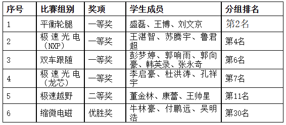 我校代表队在三天的比赛中,分别参加了平衡轮腿组、极速光电(NXP)组、极速光电(龙芯)组、双车跟随组、极速越野组和缩微电磁组共六个组别的角逐,成绩如下: